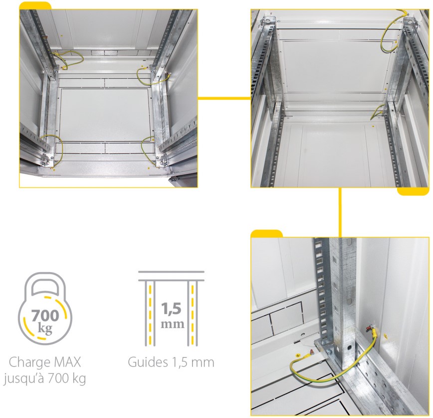 La charge statique maximale de la série P atteint 800 kg (armoires d’une hauteur de 42U et 33U) et 500 kg (armoires d’une hauteur de 18U et 24U), ce qui permet d’augmenter le volume des équipements et offre la possibilité de appliquer des solutions non standard.